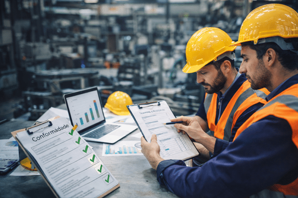 Profissionais industriais revisando registros de treinamento e conformidade para preparação de auditorias regulatórias em empresas de risco 3 e 4.